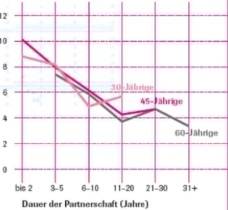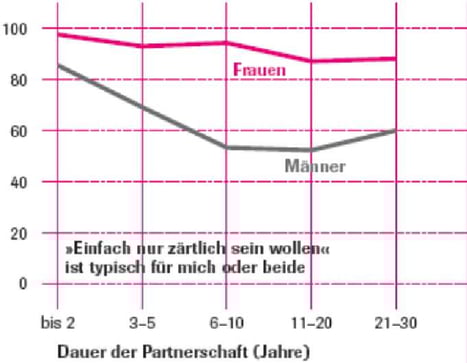 Die Öde in den Betten kommt nicht daher, dass der Wunsch nach Sex und Zärtlichkeit nicht bestünde, sondern indem jeder auf dem beharrt, was er will, und das andere ausschliesst. Berührt der Mann die Frau, heisst das für sie, dass er Sex will, und sie entscheidet auf Nein, weil sie nicht nur hinhalten – wie sie das mit ihrem Bedürfnissen allein gelassen empfindet – und dann leer ausgehen will. Das hat sich mit zwei, drei Jahren eingeschliffen, und dann ist es vorbei mit der Gemeinsamkeit. Bei Ihm verstärkt sich zunehmend der Frust, mit einer Schmarotzerin zusammen zu sein, die nur Zärtlichkeit beziehen, aber keinen Sex liefern will. So vergeht einem bald auch noch die Freude an dem, was noch ginge zusammen, und Stabilität kommt nur noch aus materiellen Zwängen, vor allem dass die Kinder eben von diesem Partner sind, auch wenn die Altersvorsorge in das gemeinsame Haus investiert ist, und den Konventionen der Gesellschaft. Was jetzt aber hilft, ist erstens Sport, um den Testosteronspiel oben und sich gesund und knackig zu halten, und zweitens nicht nur auf dem Eigenen zu beharren, sondern für den andern auch etwas auf sich zu nehmen. Der Mann kann nach dem Orgasmus und dem Zurückkommen nicht einfach liegen bleiben und die Frau wenn möglich durch das „beliebte“ Einpennen noch ganz alleine lassen. Es ist nicht mühsam, aber seine Aufgabe, nicht peinlich jede Form zu verlieren. Und mit dem Alter hat die Potenz des Mannes nicht viel zu tun (Häufigkeit des Geschlechtsverkehrs pro vier Wochen, nach Altersklassen):