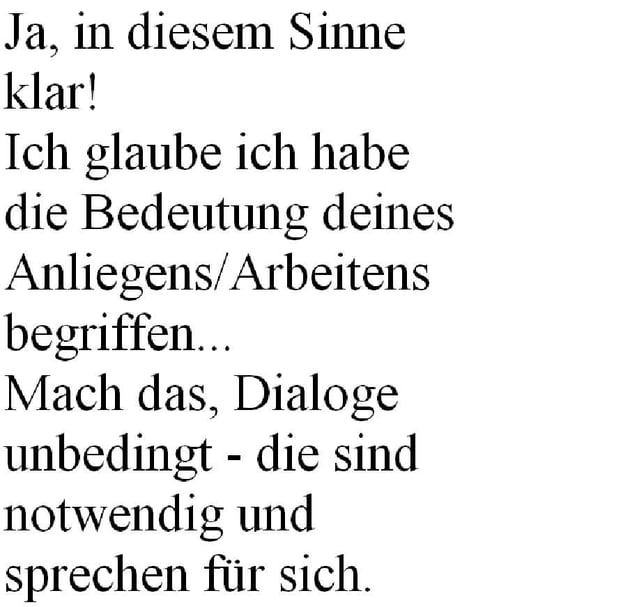 „Musstest Dich regulieren? War es mehr als ein Spaziergang? Hat es sich gelohnt, mit dem Antworten jeweils so lange zu warten? Ich war doch noch recht engagiert für Dich. Es würde sich aber nichts Nennenswertes mehr ereignen zwischen uns. Nur Ärger. Wir hatten früher einmal ein gemeinsames Interesse. Es gab auch ein Gefühl von Zusammengehörigkeit. Ich fand Dich ein guter Typ.“
